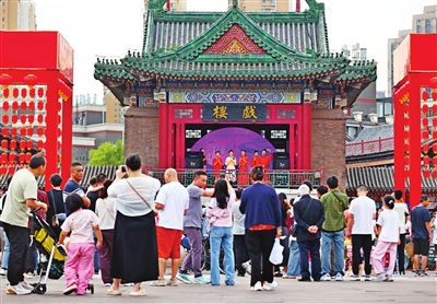 國慶假期期間,天津市以“戲聚天津·無處不沉浸”為主題,成功打造了一場全城聯動、全民共享的藝術盛宴。圖為古文化街戲樓上演曲藝劇《海河故影》沉浸版。
